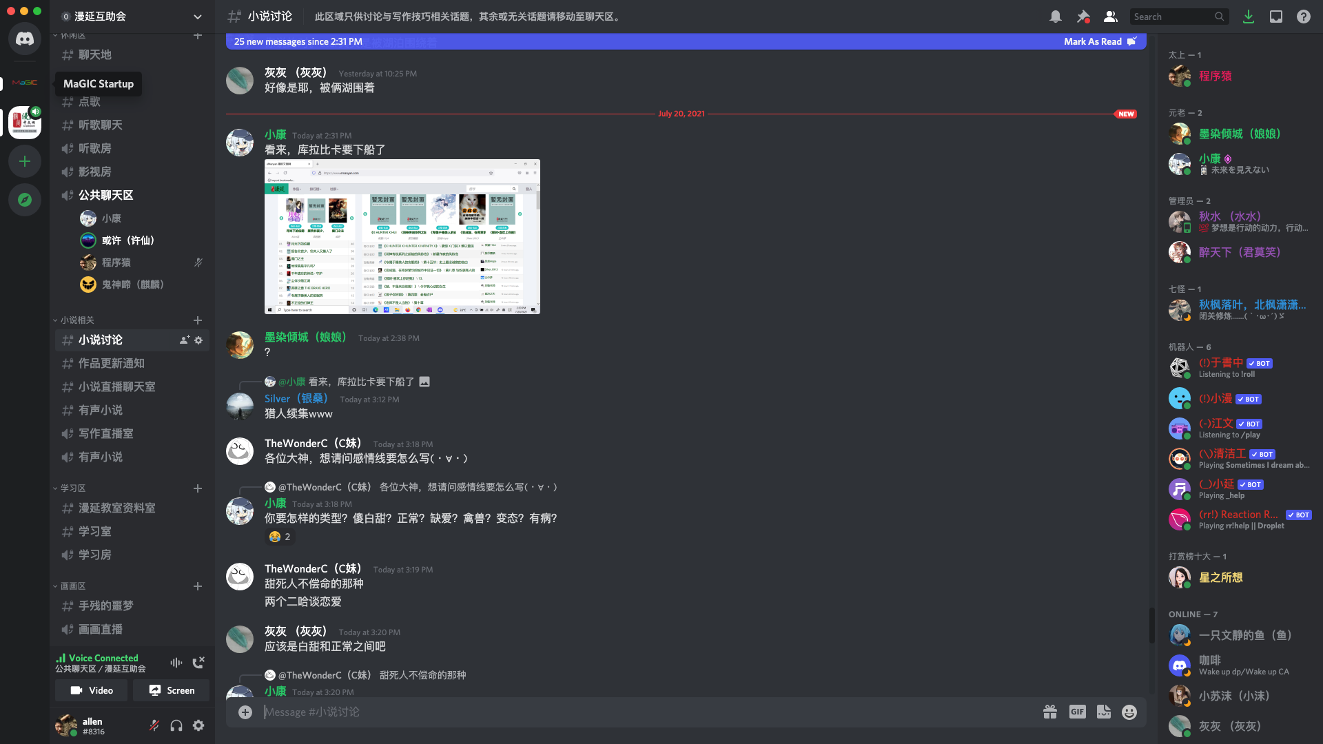 漫延网是个有活力的平台。我们的年轻创作者们自发建立了作者互助群,在漫长且孤独的创作过程里互相鼓励并同时协助新手升级。群里不定期举办线上活动,如:漫FM、小说鉴赏、讲座、分享会、执笔战等…… 如果您是作者,一定要加入我们的 Discord 群组,链接可在作者与作品操作页面获得: